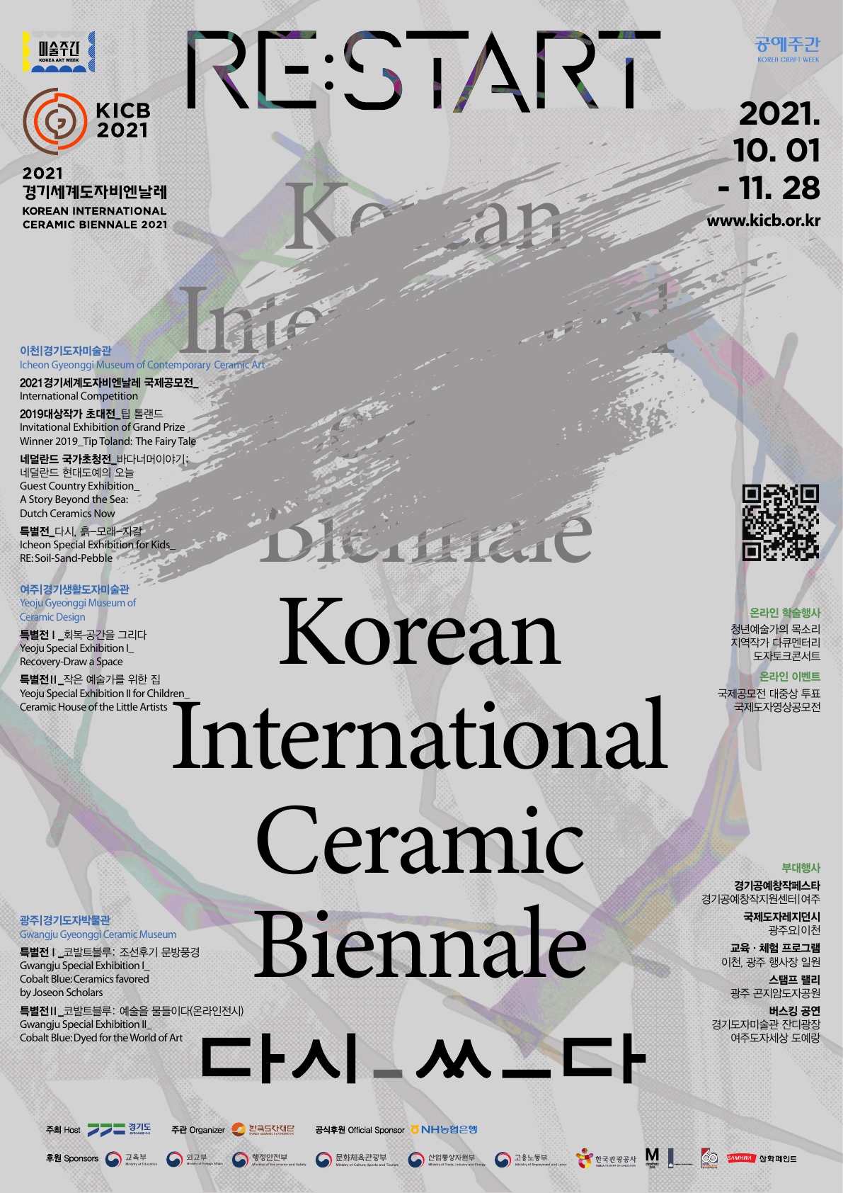2021경기세계도자비엔날레는 ‘다시_쓰다 Re: Start’ 라는 주제로 도자비엔날레의 과거와 ‘포스트 코로나’ 이후 도자예술의 역할과 의미를 짚어보고, 코로나로 지친 이들에게 도자예술을 통한 위로와 희망을 전하고자 합니다.