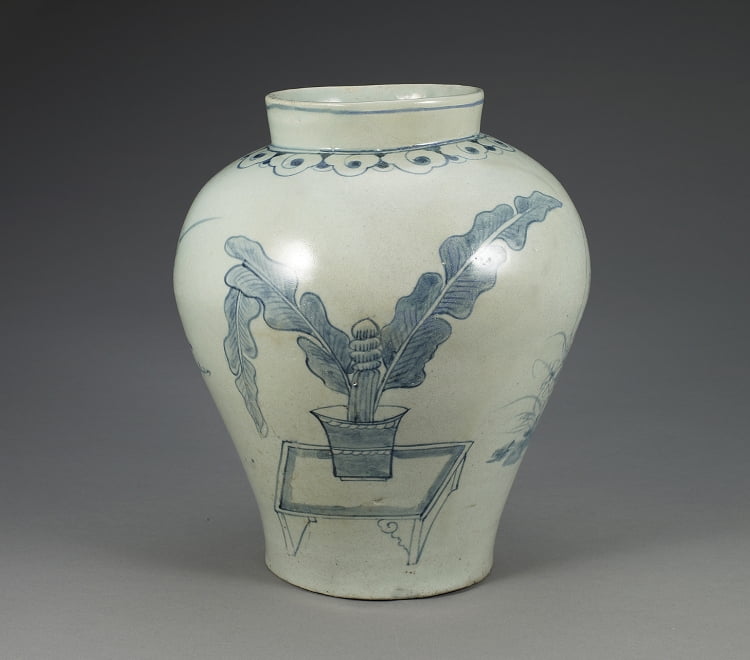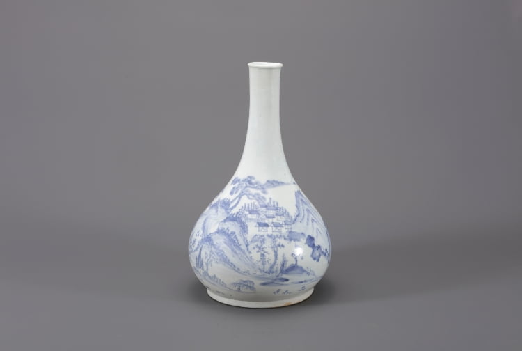 Part 1: Pure Enjoyment of Scholar’s Accoutrements examines the Joseon literati’s hobby of collection and how they enjoyed ceramics in the pure ambience of the study through blue-and-white porcelain bearing traditional motifs such as landscapes and the Four Noble Plants. This part allows for the viewers to enjoy the study reproduced with stationery, bonsai growing, and paintings of the kind that were highly prized by Joseon scholars as well as works of calligraphy and paintings depicted on the blue-and-white porcelain.